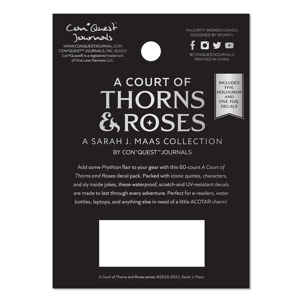 Bring the heat of the Night Court everywhere you go with this set of 60 Officially Licensed A Court of Thorns and Roses decals, including 5 holographic and 5 foil designs. From "To the stars who listen..." to "Hello, Feyre darling" and The Bat Boys, these stickers serve up the quotes that broke us, healed us, and made us blush.