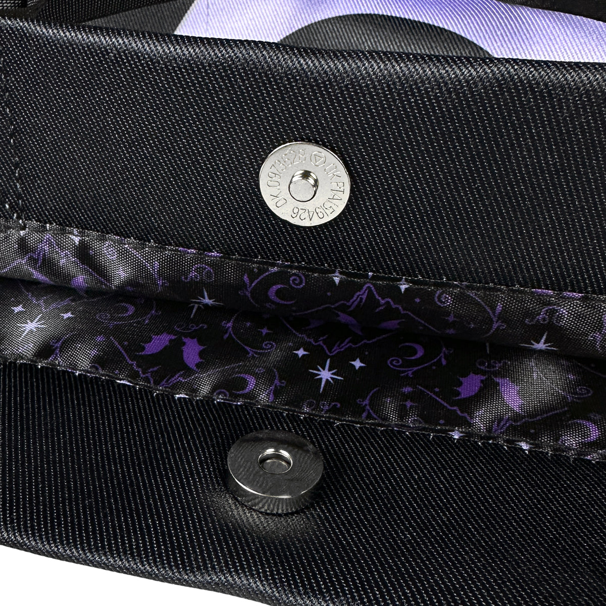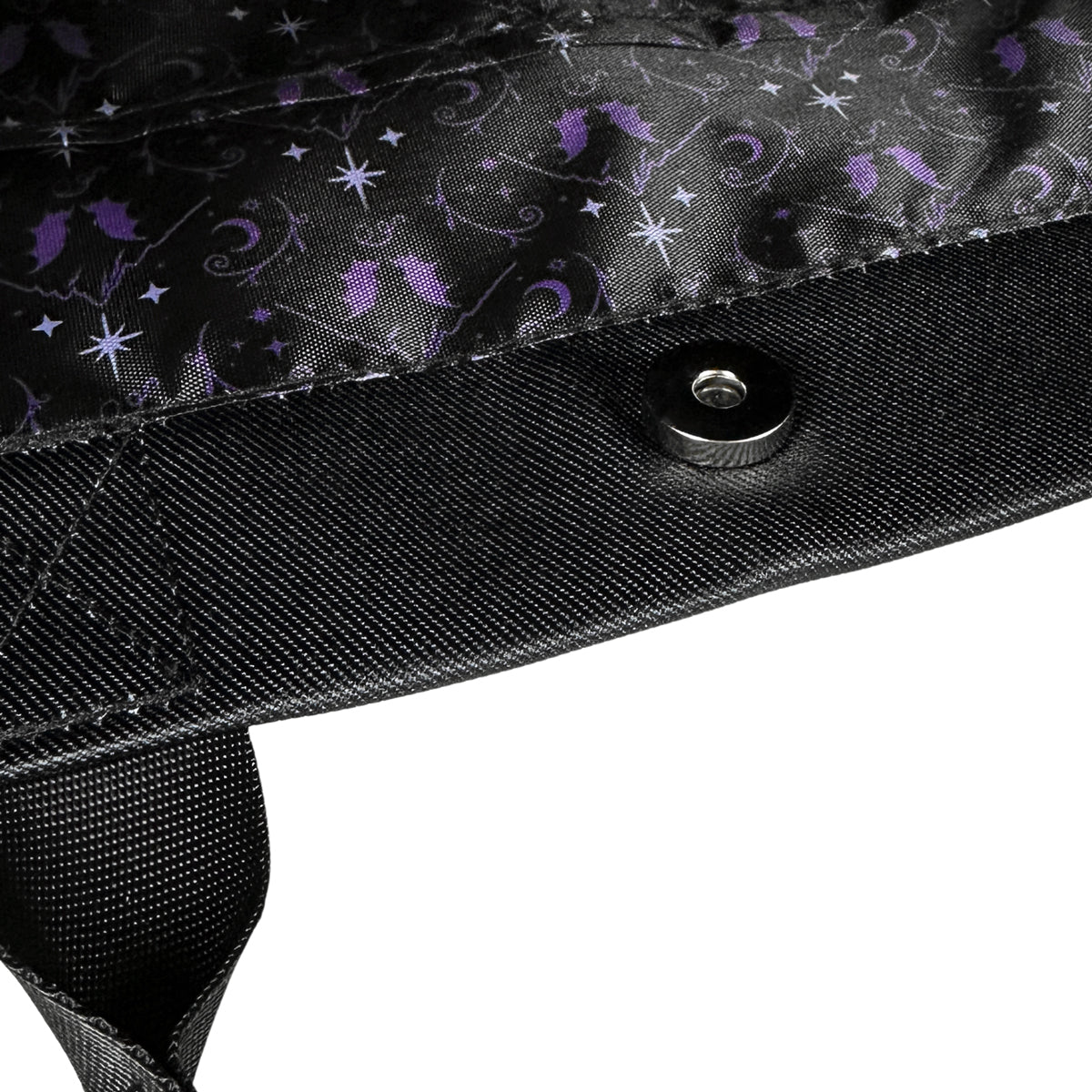 Inside, you'll find a fully lined pattern of bat wings, stars, and mountains, plus a snap closure and patterned interior pocket. It's the kind of bag you'll want at your side whether you're heading to Rita's... or winnowing away without warning.
