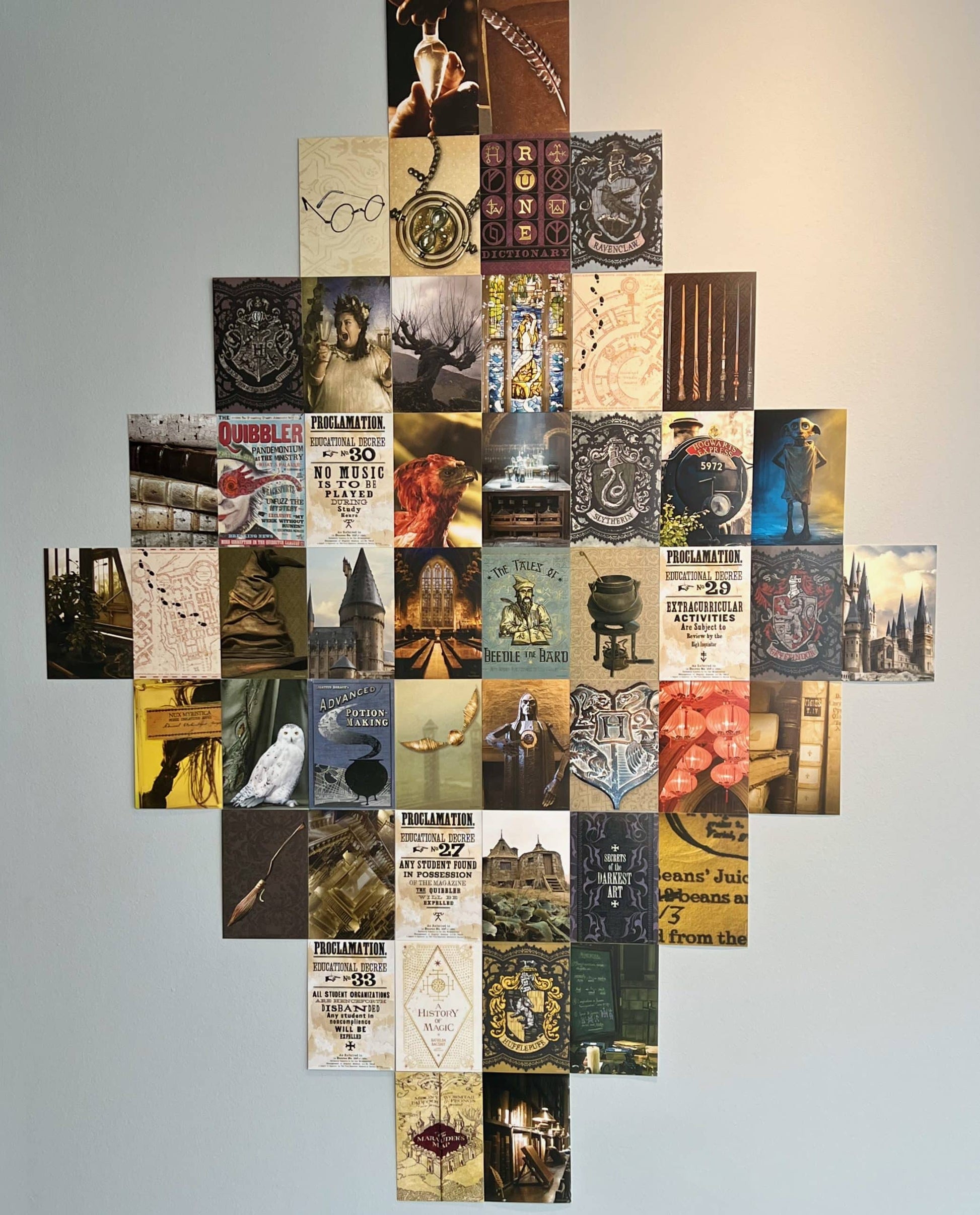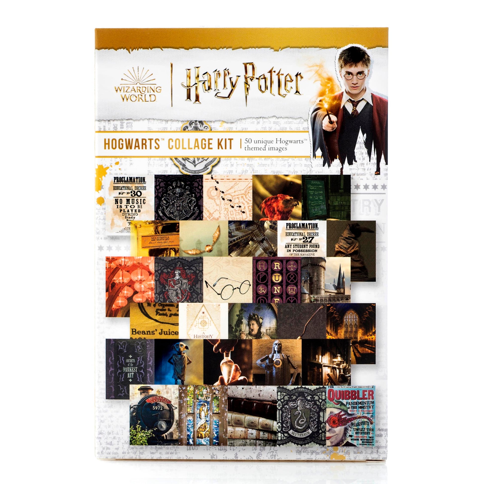 Bring Hogwarts Home with our new collage kit! This set of 50 4'' x 6'' unique images from Hogwarts includes textbooks, classes, potions, Fawkes, the Fat Lady, the castle itself, the Great Hall, and more! Printed on quality cardstock, you can frame these, create a gallery wall, or hang them together on your walls with low-tack tape or removable hanging squares! You can also use these prints in paper crafting, and journals or send them as postcards!
