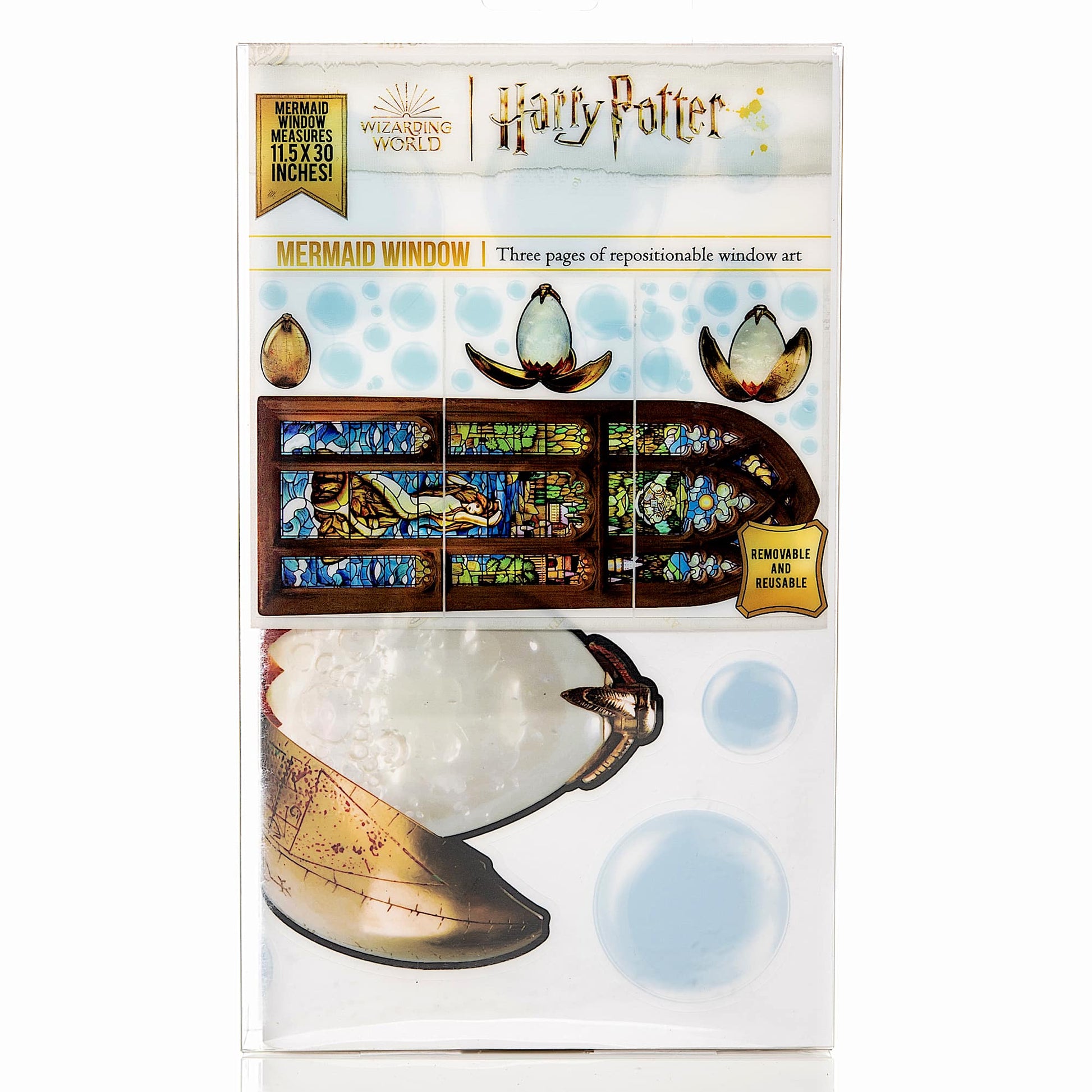 You won't need access to the Prefect's Bathroom to enjoy the beautiful Mermaid stained glass window! The 11.5'' x 30'' Mermaid Window Clings come in 3 sections and fit together to recreate the iconic window as seen in the films. To add to the magic, there are over 20 floating bubbles as well as the golden egg! Add to a bathroom mirror and recreate the scene! Made from waterproof PVC, the designs can be seen on both sides of the window. Simply peel and stick these clings to any smooth surface like mirrors and windows, then remove them without residue!