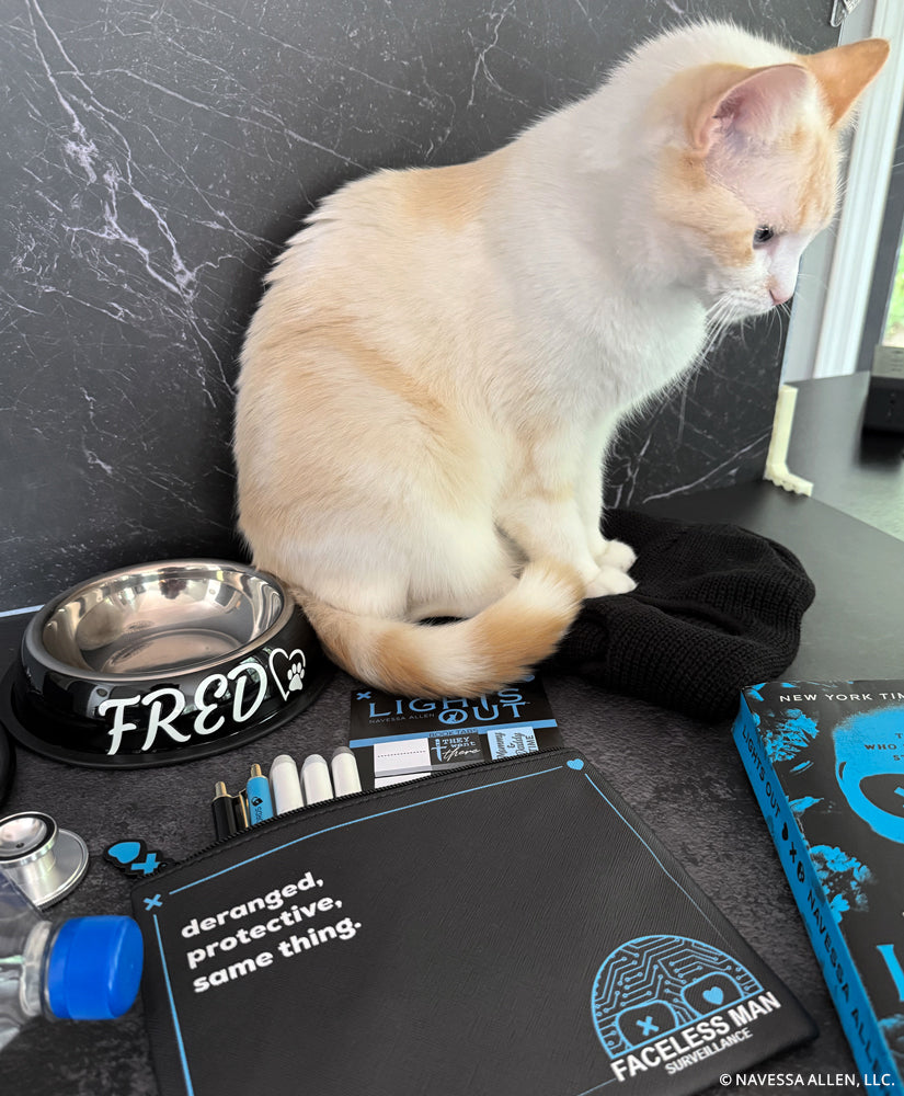 Deranged? Protective?... If it's the same thing to you, we've got you covered! This 6'' x 8'' Officially Licensed Lights Out Pen & Pencil Pouch is inspired by Navessa Allen's best-selling book ā bringing morally gray energy straight to your backpack, purse, desk, or nightstand. Complete with a PU leather exterior, bright blue interior lining, and an enamel zipper charm featuring the iconic "āļø + š".