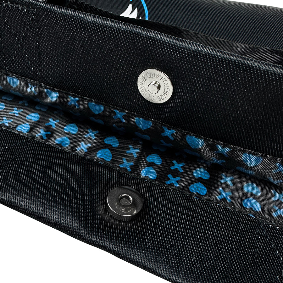 - Interior lining features the iconic blue X and Heart pattern