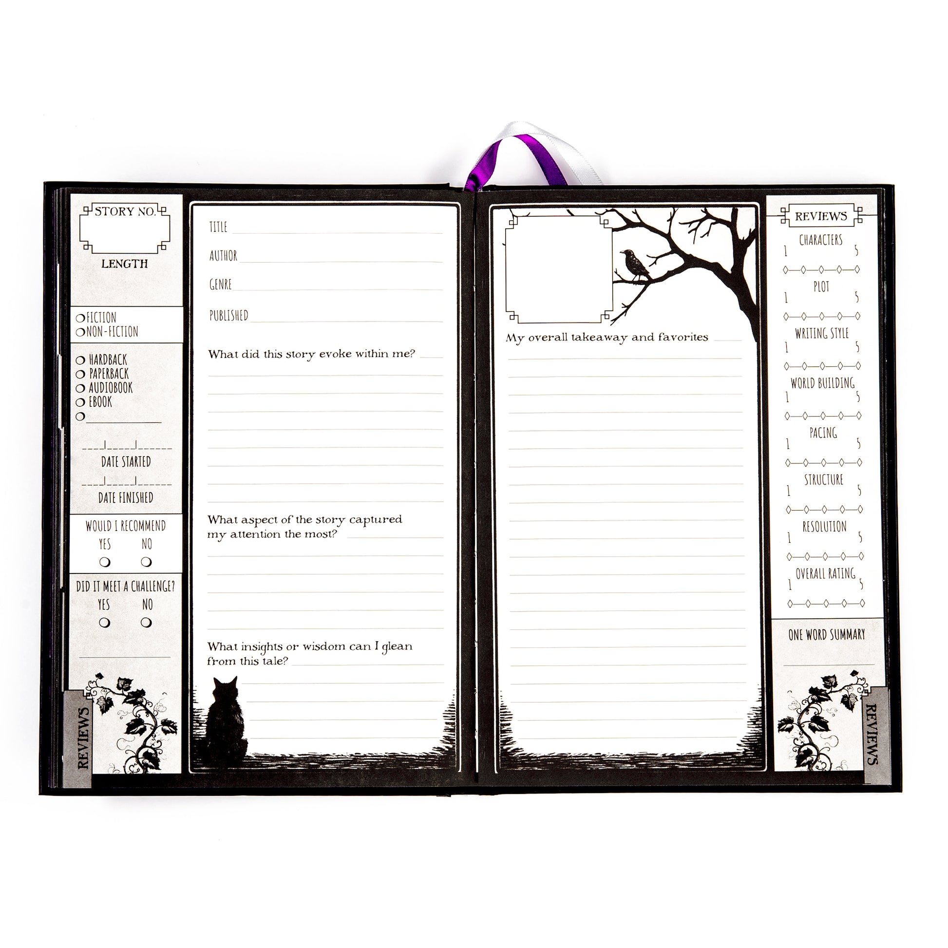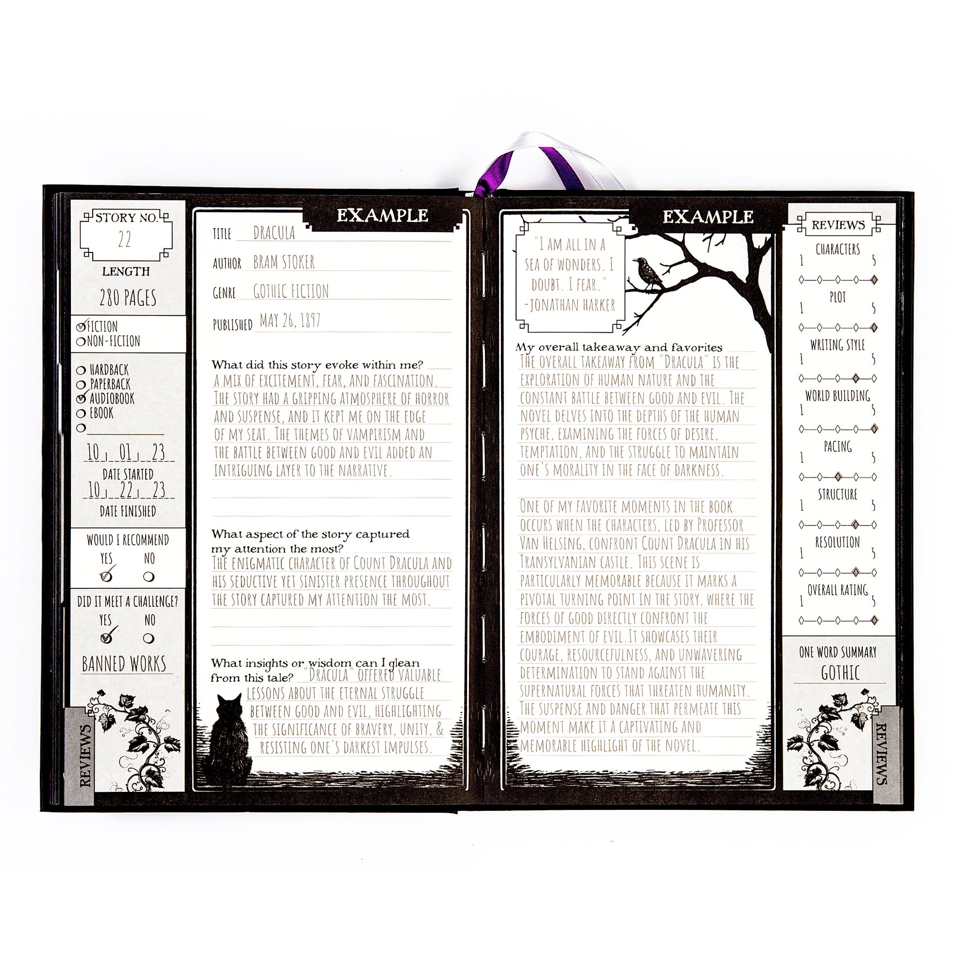 Unveil the allure of the written word with our "Waiting for the Night Reading Journal," a gothic-inspired companion for avid readers. This meticulously crafted journal is designed to capture your literary journey, offering dedicated pages for tracking your reading progress, exploring banned books, conquering reading challenges, managing your TBR (to-be-read) list, and reflecting on unfinished tales. After the final page is turned, share your thoughts, feelings, and insights about the books you've read on the review pages complete with prompts and rating notes. Let your inner critic shine!